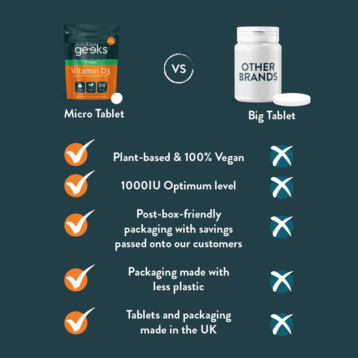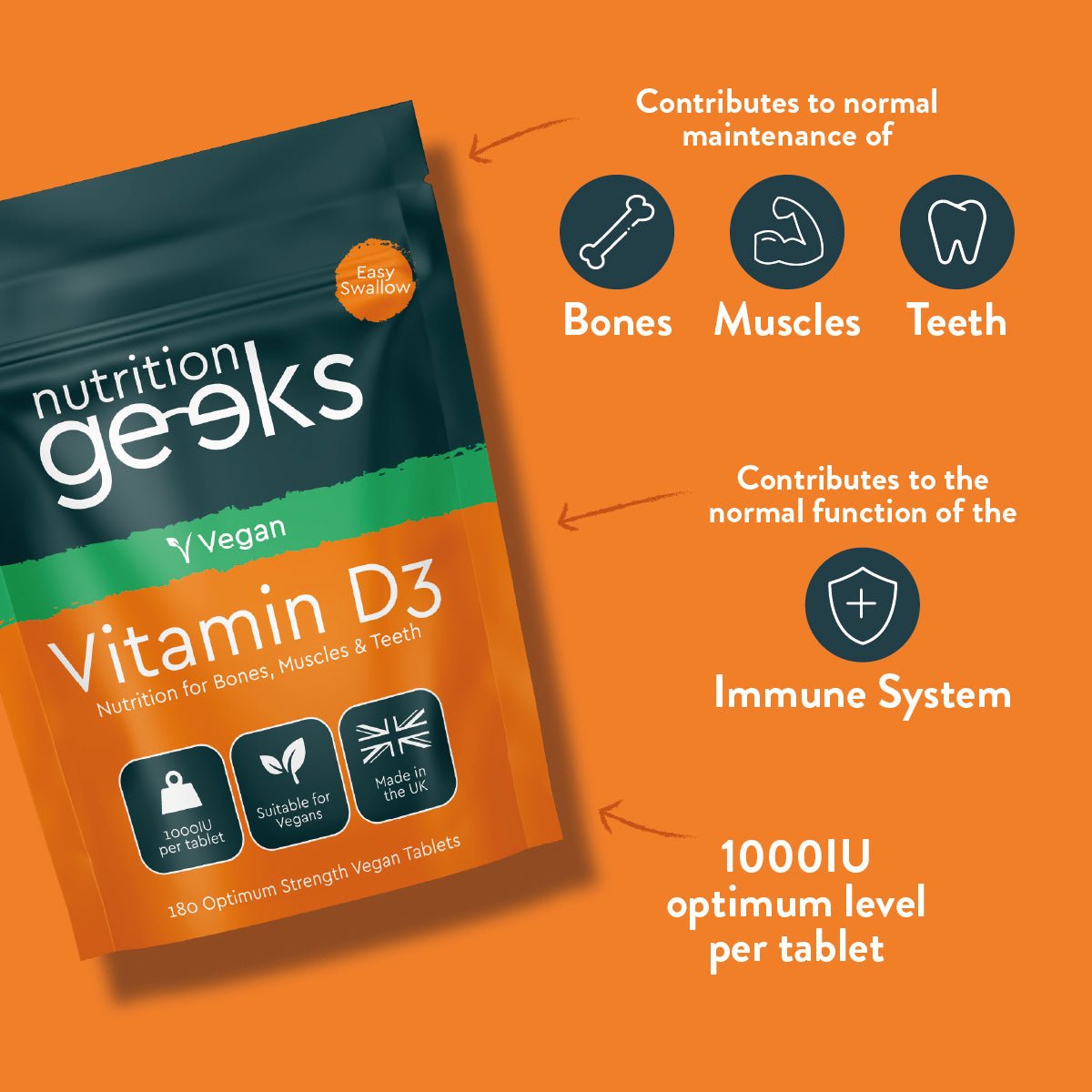 Each tablet contains 1000iu of Vitamin D3, providing 500% of your Nutrient Reference Value (NRV) for maximum health benefits.
